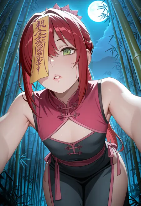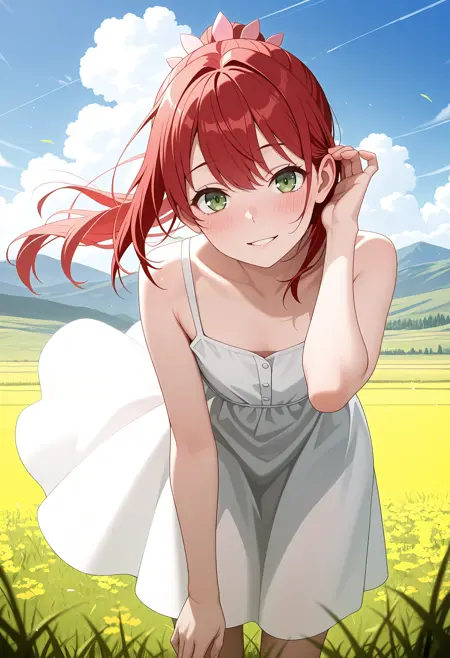 KJOalise, red hair, green eyes, long hair, ponytail, pink ornament,