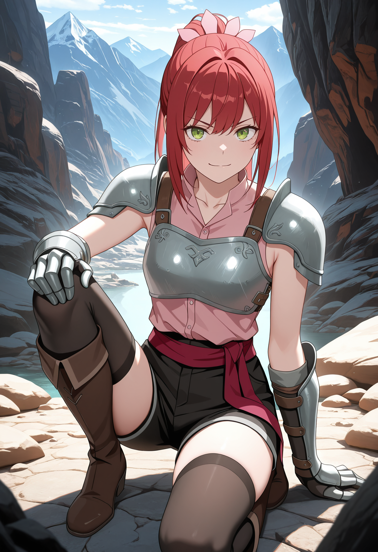 pink collared shirt, mandarin collar, black shorts, black thighhighs, sleeveless, breastplate, armor, gauntlets, red sash, brown belt, pauldrons, shirt tucked in, collarbone, brown knee boots,