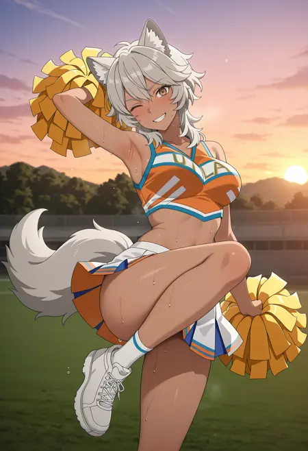 KJOneze, grey hair, brown eyes, wolf ears, wolf tail, medium hair, dark-skinned female,