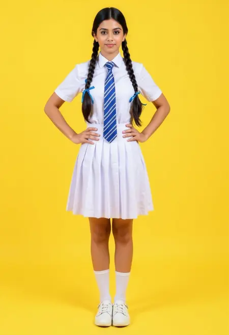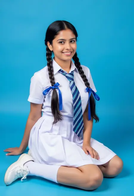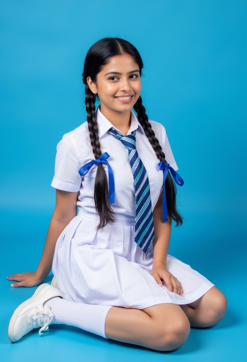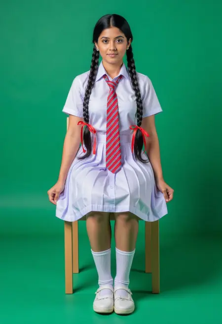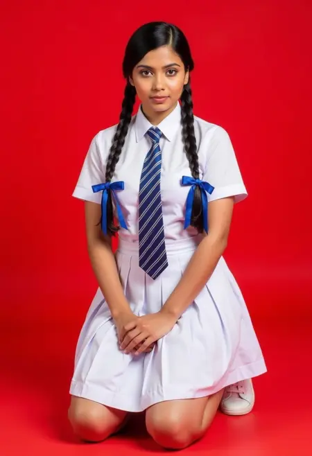 SLSclGrl. A Sri Lankan schoolgirl. Beautiful young Sinhalese woman. She has flawless fair skin. Long black hair. Hair styled in two braids. Red ribbons tied at hair braid ends. Pristine white school dress. Pleated knee-length skirt. Red and white striped tie. White socks and white school shoes. Adult look. She is sitting on the floor hugging her own knees. The background is green.