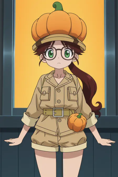 brown hair, long ponytail, black-framed eyewear, round eyewear, brown jacket, brown shorts, pumpkin hat, brown belt, brown shirt