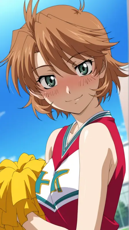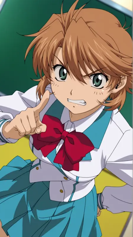 복장: 학교 유니폼, 치마, 빨간 리본,