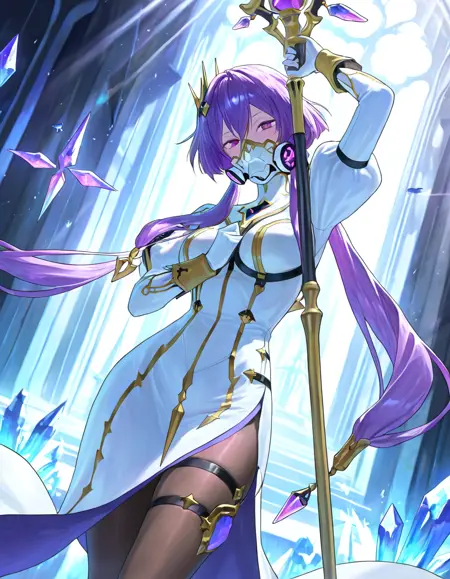 szbEsperanza, 1girl, solo, purple hair, gloves,white mask, staff, holding, holding staff, white gloves, pantyhose, long hair, puffy sleeves, black footwear, respirator, long sleeves, hair between eyes, crystal, dress, white dress, hair ornament, white coat, purple eyes, thigh strap, breasts, juliet sleeves, gold trim, boots, brown pantyhose, coat, gem, low twintails, twintails, side slit, black pantyhose,