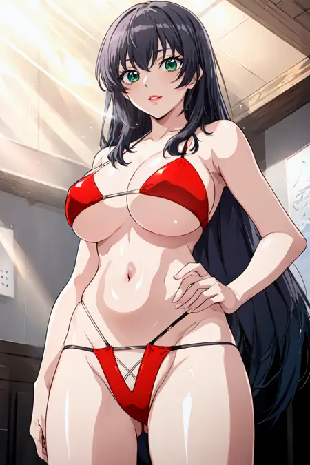 외모: 모리노 유우코, 긴 헤어, 초록색 눈, 큰 가슴, 립스틱