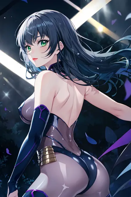 바디슈트: 보라색 바디슈트, 바디스톡킹, 팔꿈치 장갑, 허벅지 부츠