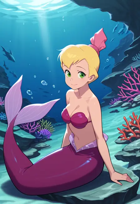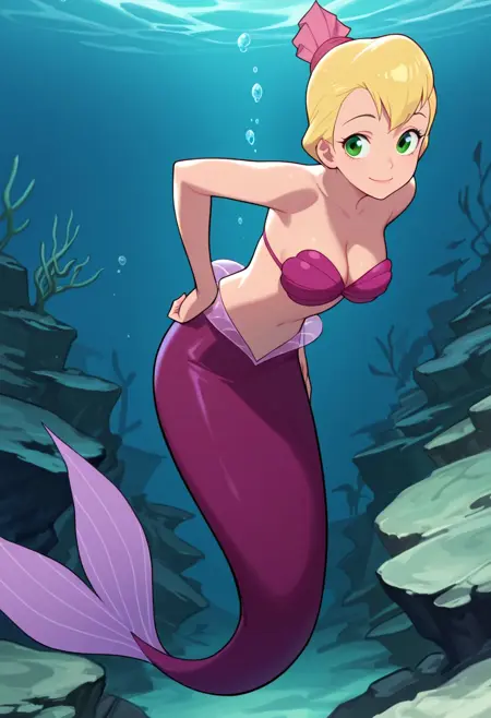 外观:金发,短发,绿眼,发饰,中等胸部,怪物女孩,美人鱼,紫色尾巴,鳞片