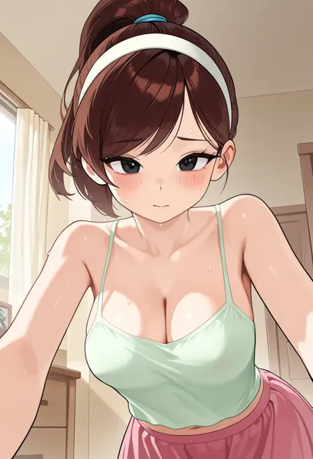 black eyes, brown hair, swept bangs, ponytail hair, white hairband, hair tie, light green camisole, pink skirt,