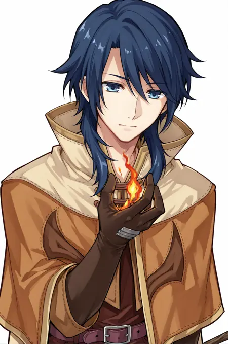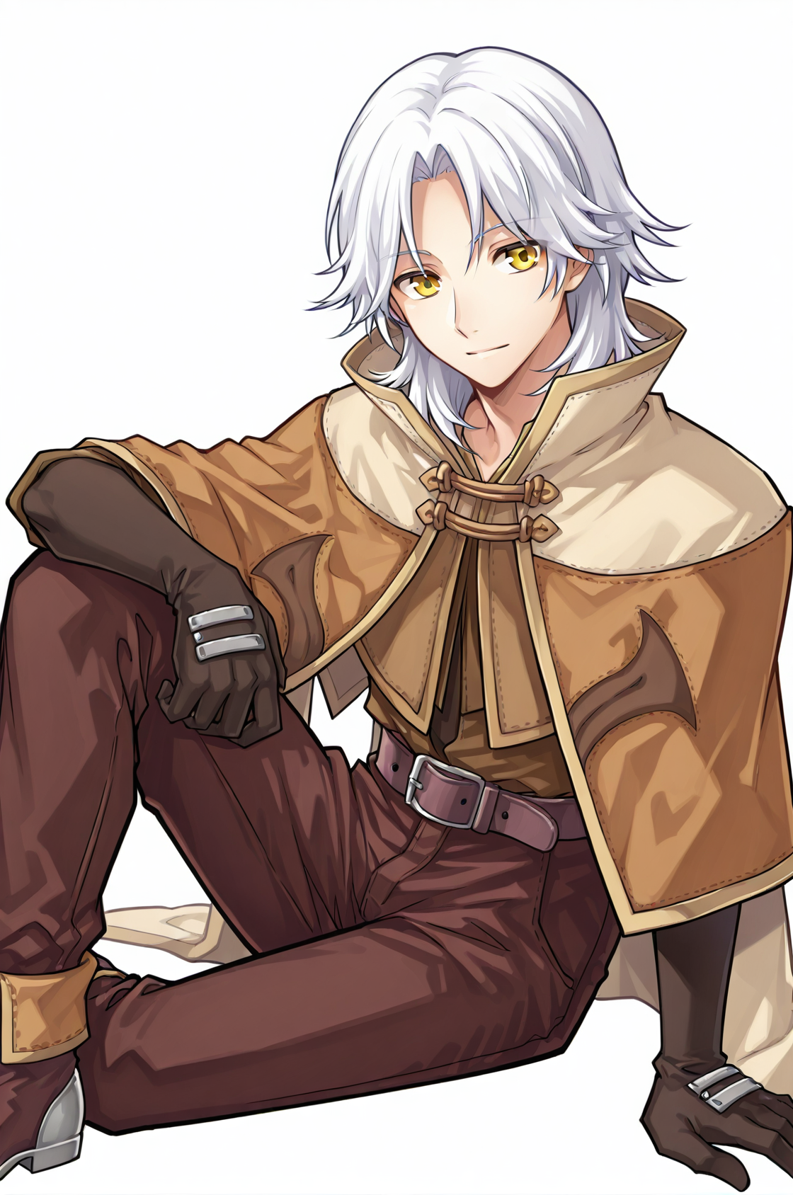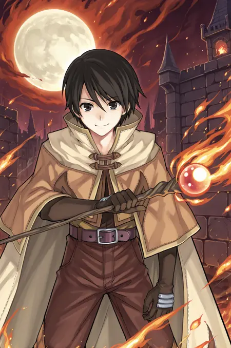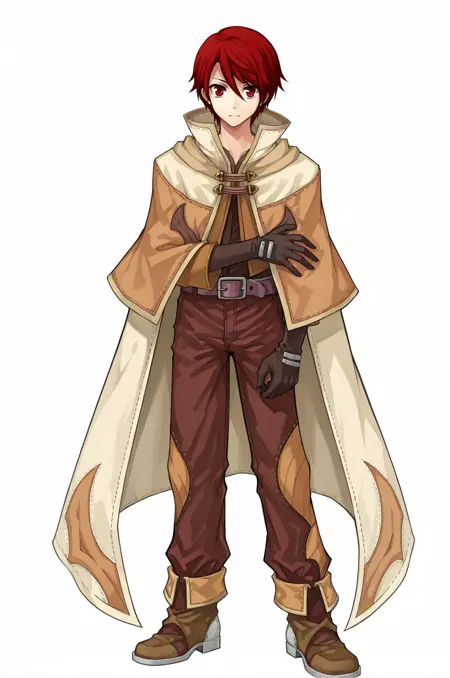 프롬프트: mageROMale, 검은 팔꿈치 장갑, 장갑이 셔츠 소매 아래에 위치, 벨트, 갈색 바지, 갈색 망토, 갈색 망토 조각, 로브, 갈색 신발