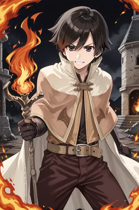 prompt: mageROMale, black elbow gloves, glove underneath shirt sleeve, belt, brown pants, brown cape, brown capelet, robe, brown shoes