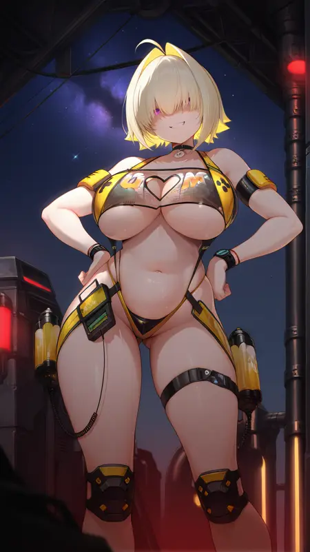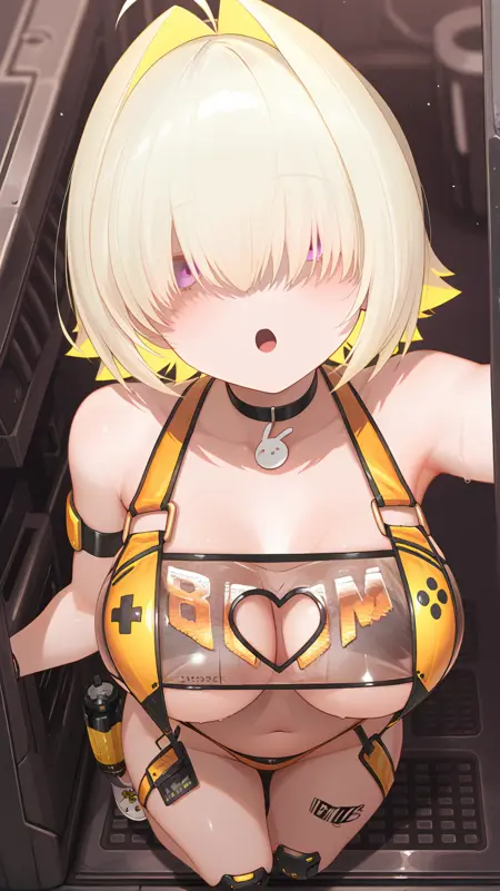 예시 프롬프트: 짧은 헤어, 앞머리, 금발, 거대한 유방, 머리카락이 얼굴을 가림, 눈 위로 덮인 머리카락, 보라색 눈, 코렉, 수영복, 손목밴드, 무릎 패드, 투명, 옷 절개부, 언더부브,