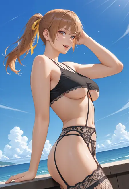 Basic prompt: "MidnightClams_doaxvv,black clothes,underboob,lace trim,crossed thong,crossed strap,jewelry,garter belt,garter straps,lingerie,black panties,fishnet thighhighs".