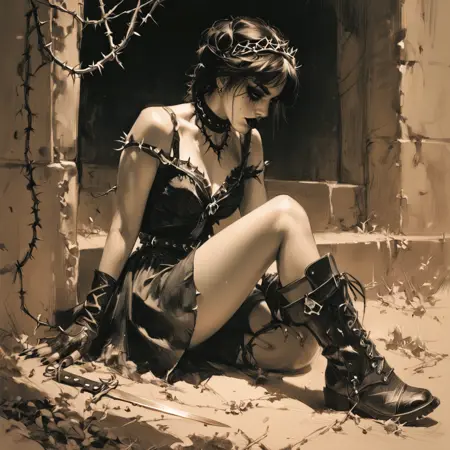 A raw and expressive sketch style that meres charcoal-stained gothic fantasy with smudged shadows and rough grain.