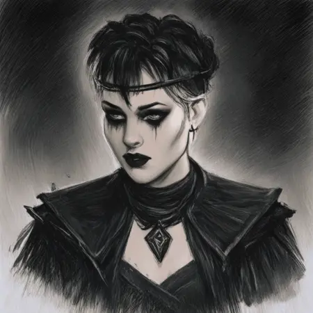 A raw and expressive sketch style that meres charcoal-stained gothic fantasy with smudged shadows and rough grain.