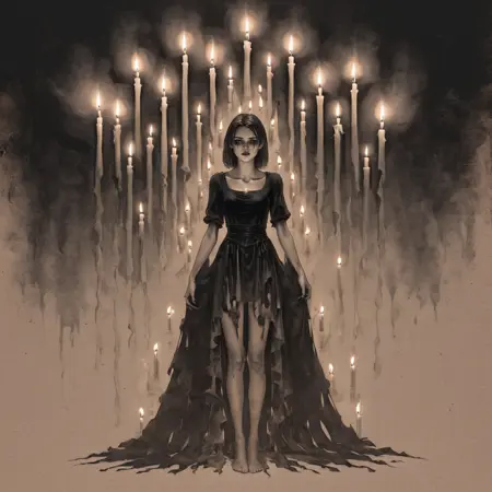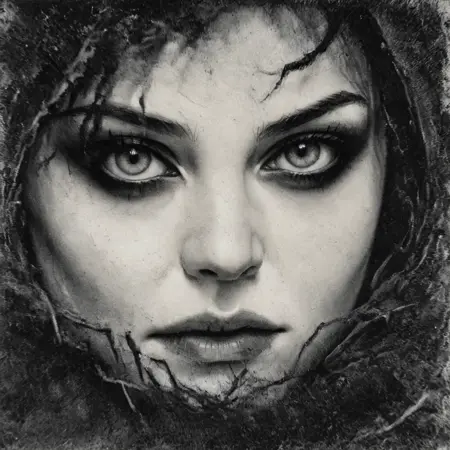A raw and expressive sketch style that meres charcoal-stained gothic fantasy with smudged shadows and rough grain.