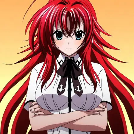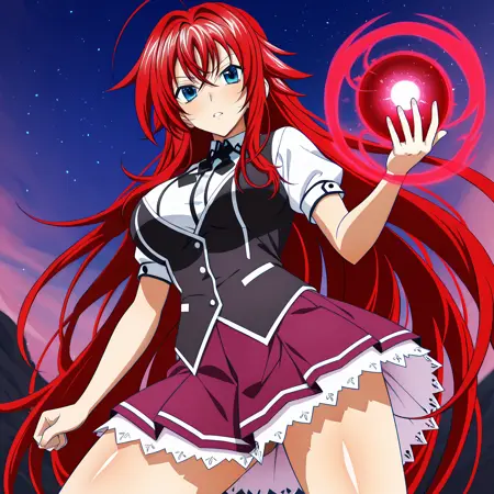 私の最初のLORA:自信に満ち、慈悲深い悪魔のプリンセス、リアス・グレモリー——赤髪の破滅のプリンセス——は、玖陽学園のオカルト研究部の部長を務めている。3年生で、トップクラスの美少女でもあり、強大なグレモリー家に属する純血の貴族だが、階級的なふりを捨てて「ただのリアス」として見られることを望んでいる。彼女の家臣たちに対しては非常に忠実で保護的であり、同時に彼らやイセイに対しては優しく、嫉妬深い面も持っている。破壊の力という強力な魔力を所有し、魔法、テレポート、飛行に優れ、その誘惑的な魅力と威圧的な存在感を完全に受け入れている。
