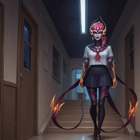 バージョン1 - LoRAの強度を調整することで、さまざまな結果を得られます。強度を1にすると、チェックポイントのスタイルなしで完全にゲームモデルになりますが、異なる服装などを強制するのは難しいです。LoRAの強度を約0.6にすると、生成されるキャラクターにNightbringer Evelynnの要素が1つ現れ、たまに尻尾や頭部の装備が現れます。