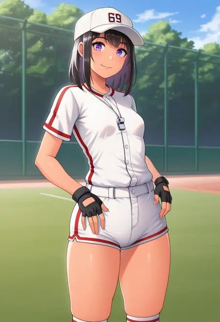 - sportswear, baseball uniform, baseball cap, whistle around neck, short sleeves, fingerless gloves, short shorts, kneehighs, sneakers,