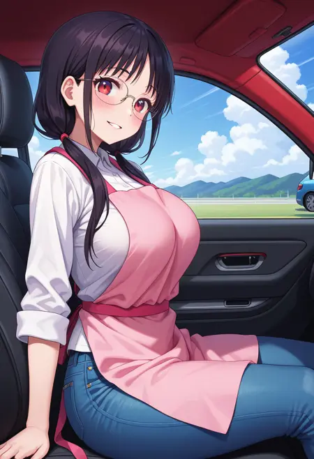 pink apron, white shirt, jeans,