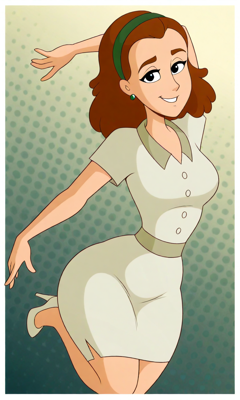 태그: ch_gloria, 검은 눈, 갈색 머리, 녹색 헤드밴드, 귀걸이, 베이지 드레스, 흰색 하이힐,