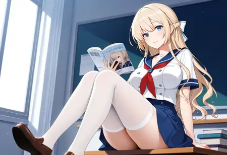 유니폼, 짧은 소매, 해적 칼라, 파란 치마, 제르타이 리오키, 흰 허벅지 스타킹, 갈색 로퍼