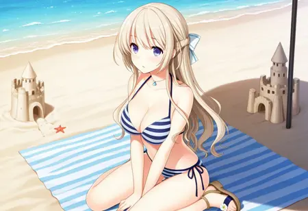 금발 머리, 긴 머리, 앞머리, 언두(시간 점프 스타일의 경우 "half updo"를 "updo"로 변경), 땋은 머리, 프렌치 땋은 머리, 머리 리본, 파란 눈, 큰 가슴, 목걸이