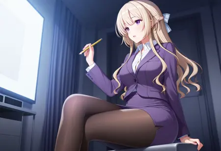 업무 복장, 스커트 수트, 보라색 재킷, 윙 칼라, 보라색 스커트, 펜실 스커트, 팬티스타킹, 흰 셔츠, 칼라 셔츠, 셔츠 단추, 흰 하이힐