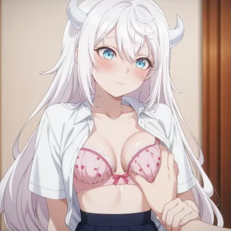 with headdress: 1girl,solo,blue eyes,black necktie,long hair,white hair,school uniform,skirt,nune veil,horns,white horns,mini horns