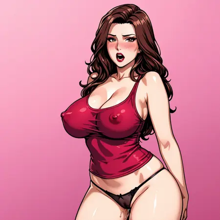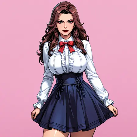 トリガー: ScarletWitchMarvelNow, 1girl, large breasts, cleavage, brown hair, red dress, lipstick, makeup, pantyhose, long hair, red gloves, mask, cowboy shot