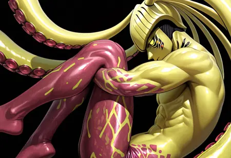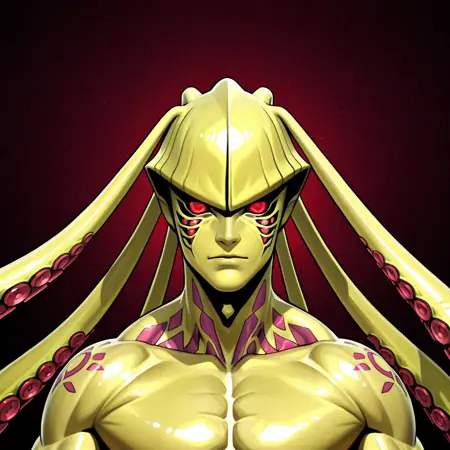 Baphomet_SMTII, yellow skin, red skin, tentacles, red eyes, tentacle hair
