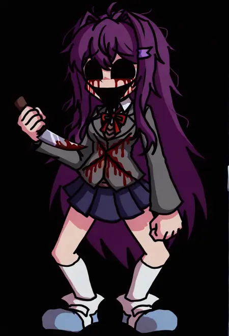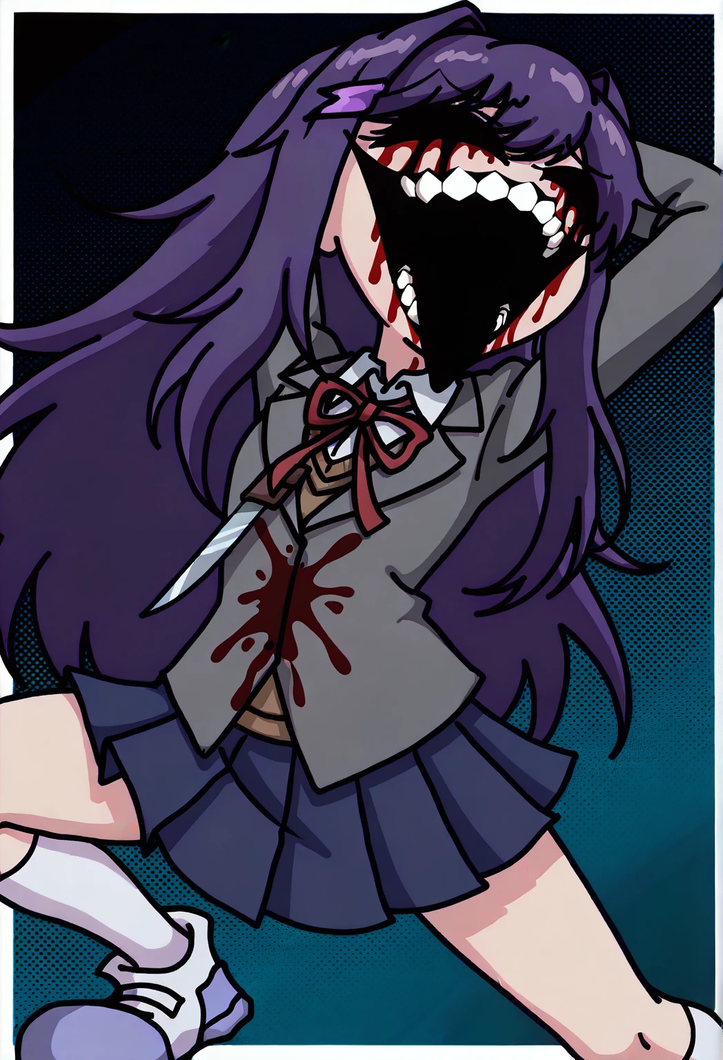 | 학습된 단어 | LadyY, 1girl, long messy purple hair adorned with a hairclip, black hollow eyes, gray-blue blazer, red neck ribbon, pleated desaturated blue skirt, Y-Shaped Blood stains on clothes, eerie aesthetic, white socks, desaturated light blue-white shoes, horror, brown sweater, collared shirt, knife on chest, bloddy tears복사됨! |