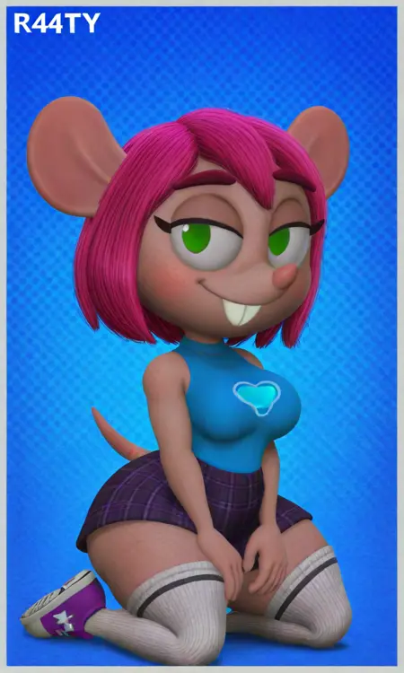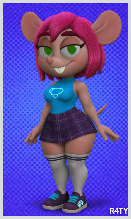 태그: r4ty, 퓨리, 쥐, 둥근 귀, 분홍색 머리카락, 녹색 눈, 쥐 꼬리, 어깨없는 상의, 치마, 흰색 허벅지 양말, 신발