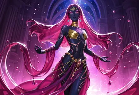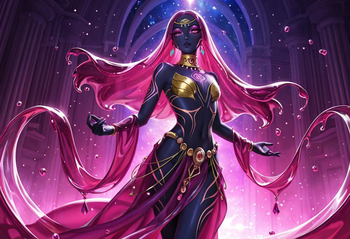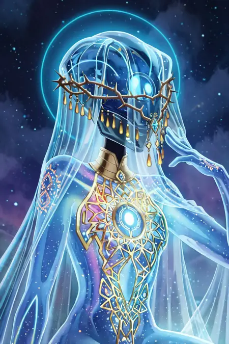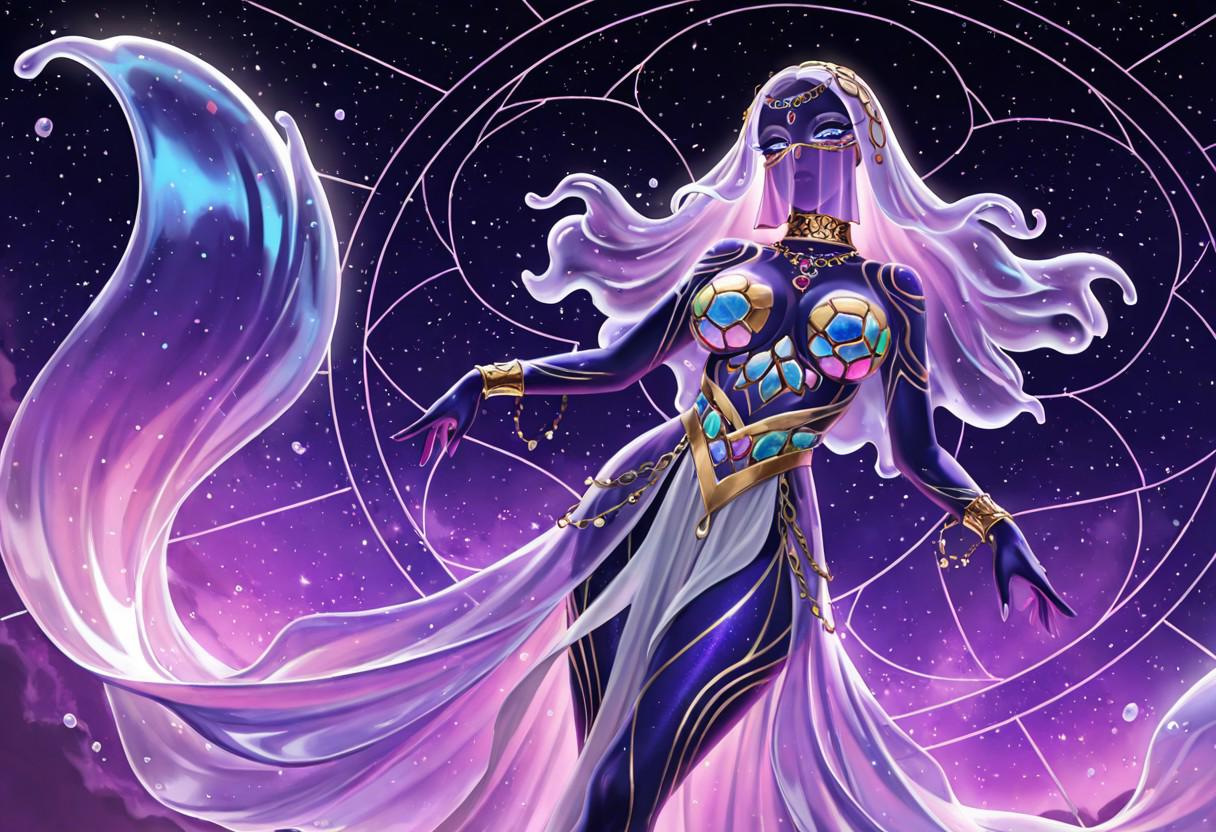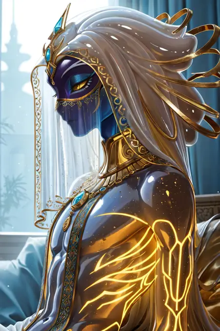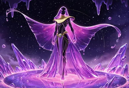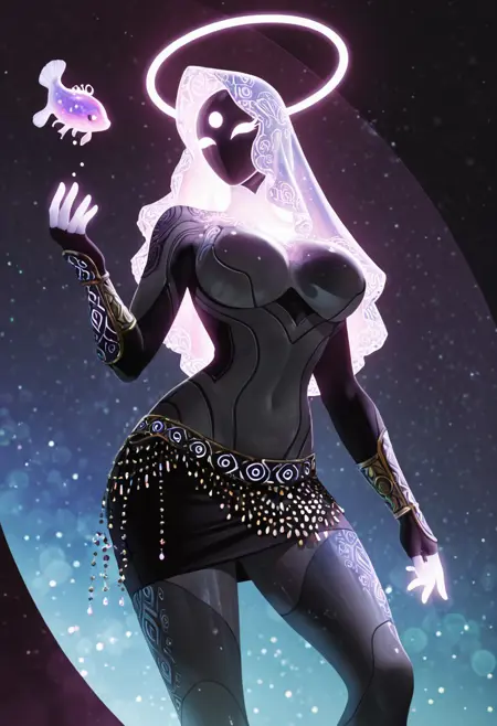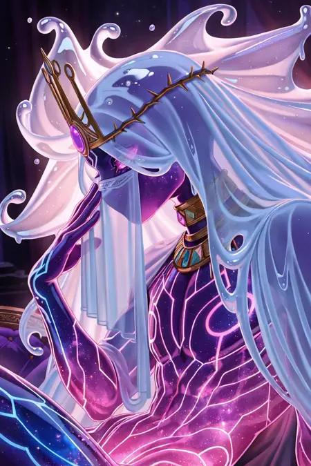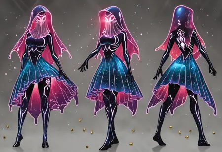 まず、布を思いつきました。人間が布で覆われたり、帽子をかぶったりしていると、実際に髪が見えなくても、まるで髪があるように見えることがあります。中世のヨーロッパから中東に至るまで、多くの歴史的な被覆スタイルがそうです。しかし、その後、別の解決策が頭の中に徐々に浮かび上がりました。このLoRAでも見られる、美しいゼリー状の形態と、一部の布のような被覆の外観を組み合わせたものです。これは、私が自身のプロジェクト向けに種を考案していたときに、作家としての頭の中で起こったことです。その種は、次第に多くの特徴を獲得し、それらは外見の説明だけでなく、外見そのものを変化させました。このLoRAは、数ヶ月にわたって、そのやや曖昧(皮肉ではなく)な概念の、少なくとも一部をアート形式で捉えようとした成果です。