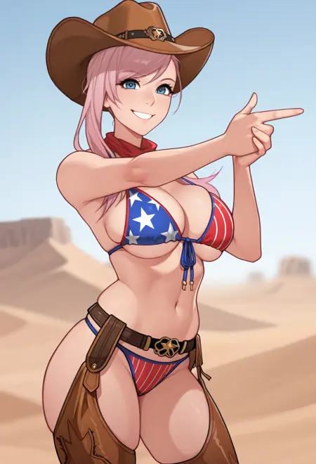 服装1:项圈,美国国旗比基尼,露胸,披肩\(衣物\),蓝色夹克,棕色手套,无指手套,单臂手套,不对称手套,腰带,过膝袜,大腿绑带,大腿靴,棕色鞋履,美国国旗腿饰,不对称腿饰