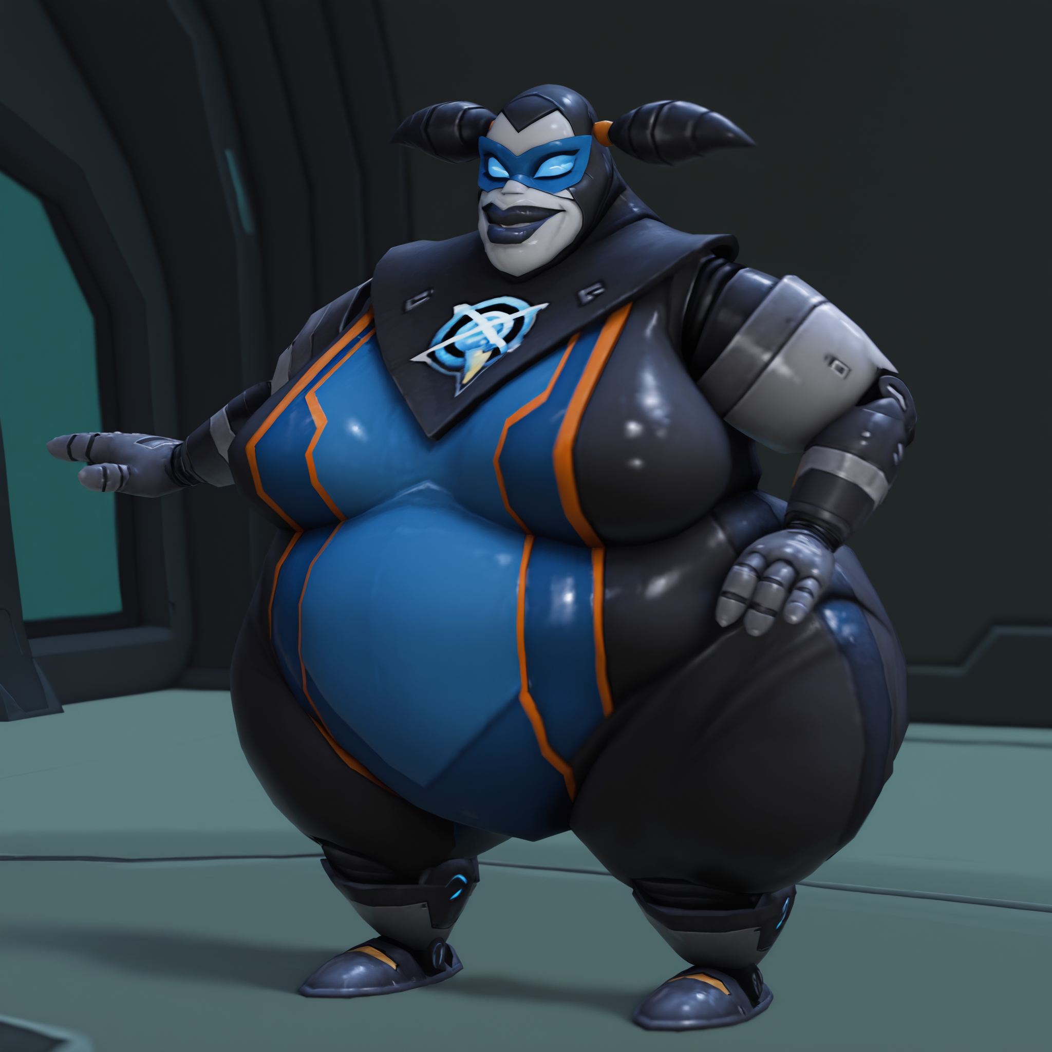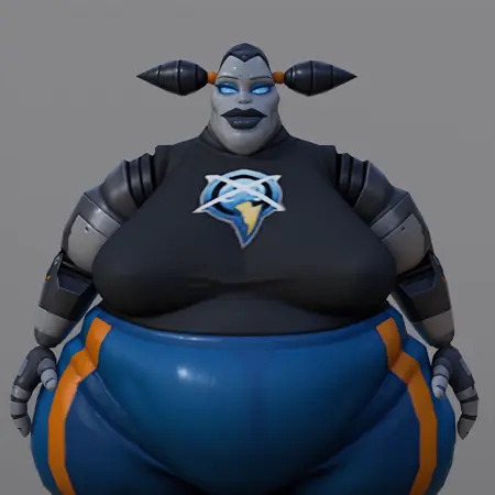 提示词: helga_rc, 女性, 机器人, 连体衣, 蓝色眼罩, 肥胖, 机器人头发扎成马尾, 灰色皮肤, 肥胖, 蓝色眼白, 大腿, 巨大臀部, 粗壮腿部, 闪亮皮肤, 黑色嘴唇