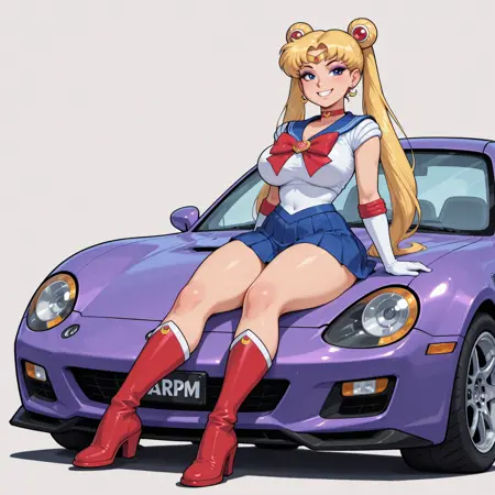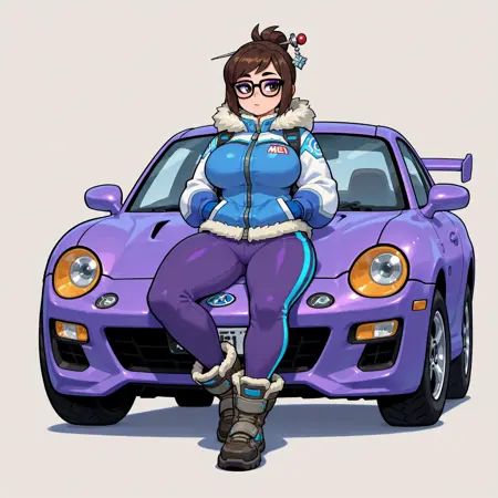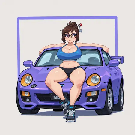 短格式提示词:hx woman, 1girl, purple sports car, sitting on car, simple background