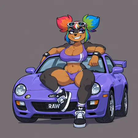 长格式提示词:hx woman, 1girl, purple sports car, large breasts, cleavage, thighs, eyeshadow, rainbow hair, sunglasses, twintails, sneakers, socks, underwear, simple background, teeth, sitting on car, wristbands