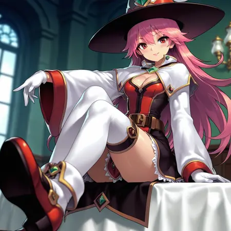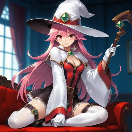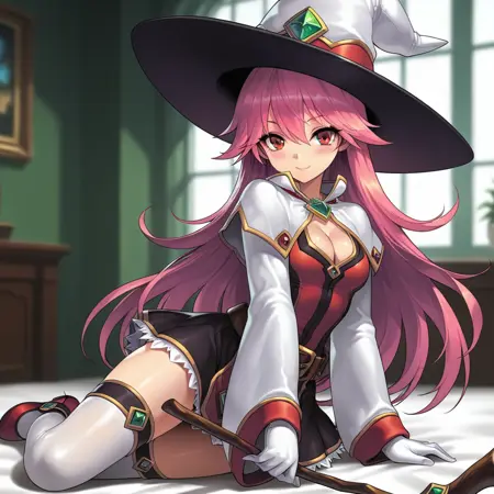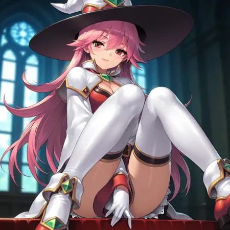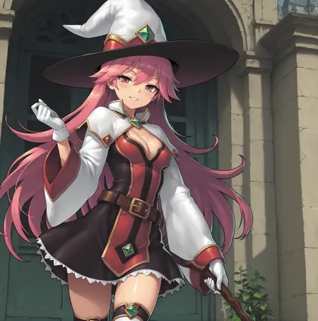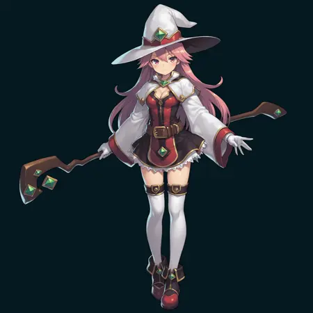 기본 트리거 용어: 1명의 소녀, Magician_GA, 혼자, 빨간 눈, 분홍색 머리, 긴 머리, 마법사 모자, 목에 녹색 보석, 중간 크기의 가슴, 분홍색 입술, 흰 장갑, 흰 코트, 흉부 노출, 넓은 소매, 긴 소매, 벨트, 치마, 흰 허벅지 양말, 빨간 신발,