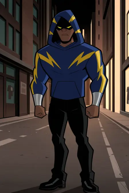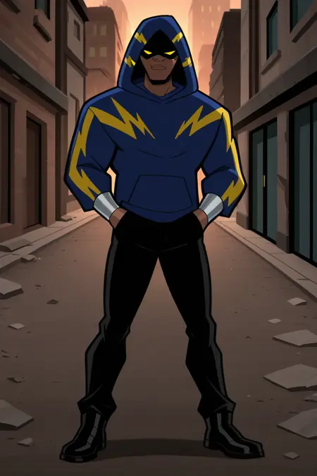 BlackLightningS1, 갈색 피부, 남자아이, 남성, 근육질, 검은 머리, 검은 마스크, 노란 눈, 진한 파란 후디, 검은 바지, 검은 신발, 은색 팔찌,