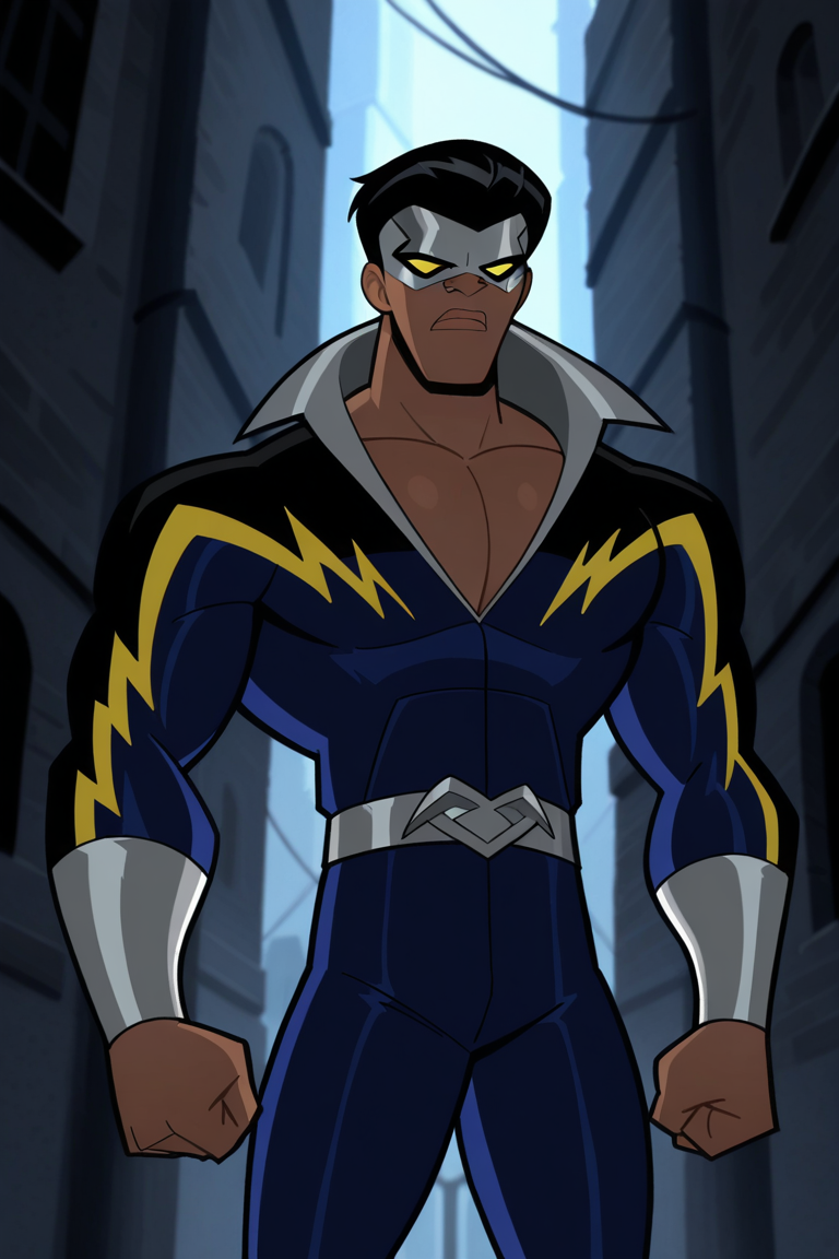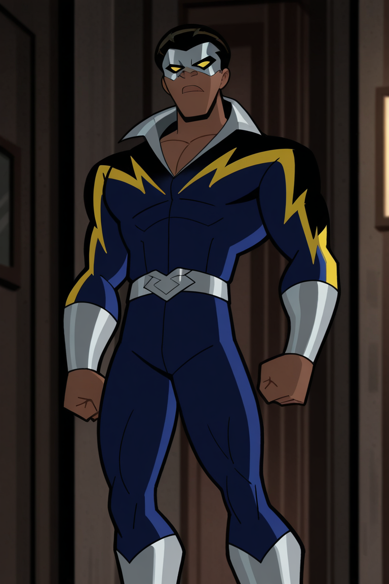 BlackLightingS2, 남성, 갈색 피부, 남성, 근육질, 검은 머리, 은색 마스크, 노란 눈, 은색 팔찌, 진한 파란 바디수트, 은색 벨트, 은색 부츠,