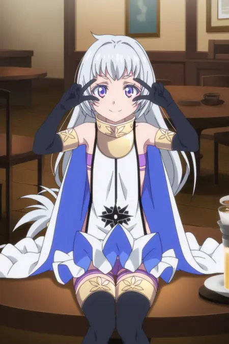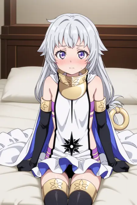 Sidonia, 1girl, solo, silver hair, long hair, bangs, purple eyes, gold choker, sleeveless white dress, open sides, black symbol, white cape, blue lining, black gloves, elbow gloves, gold armband, black thighhighs, gold thigh band, anime_screenshot, hair ring,