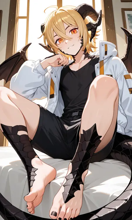 1boy, dragon boy, black dragon horns, blonde hair, black face scales, orange eyes, white jacket, black dragon tail, black t-shirt, black shorts, black fingernails, black toenails,
