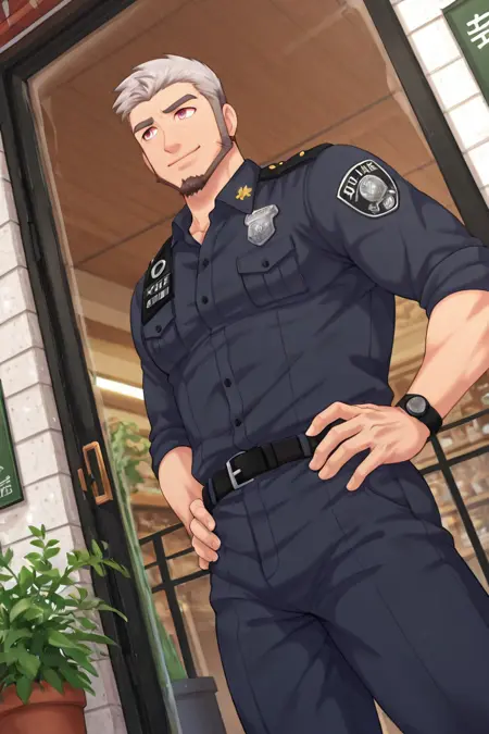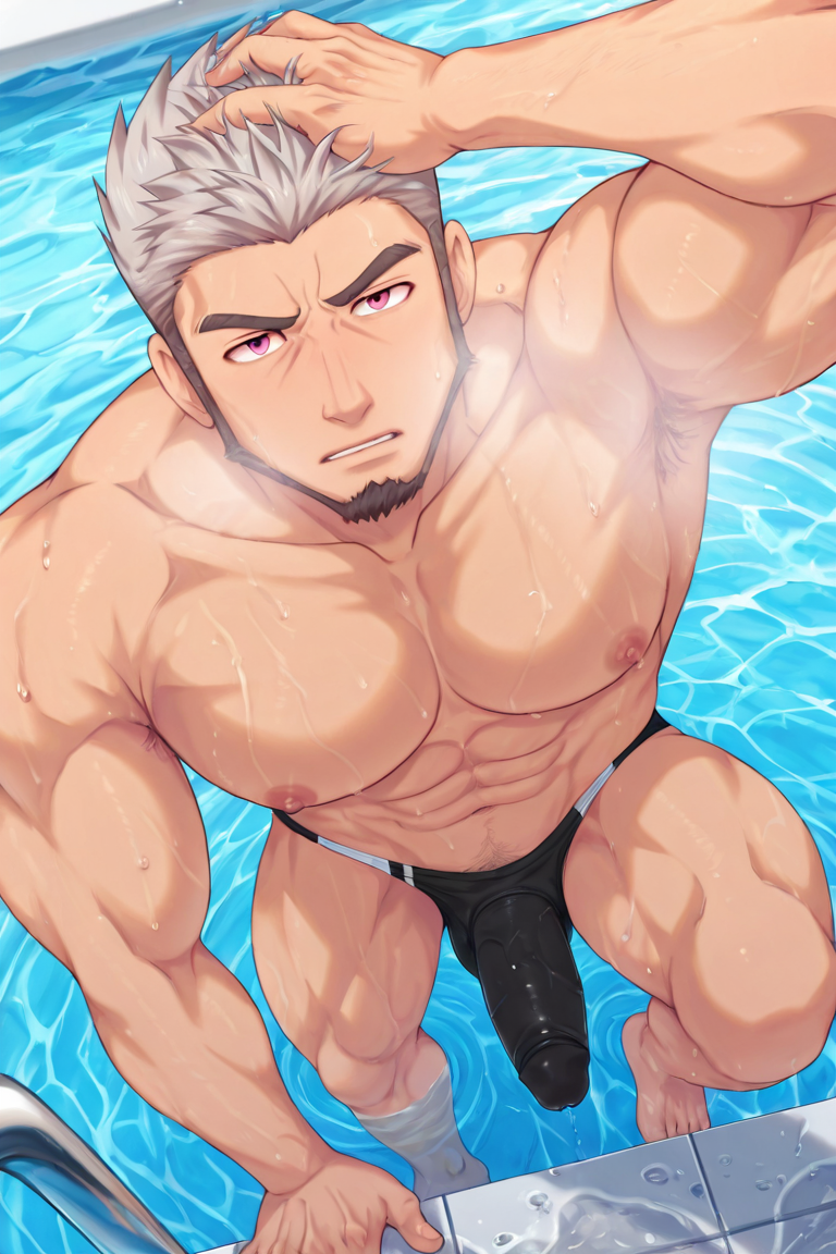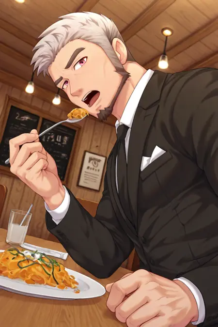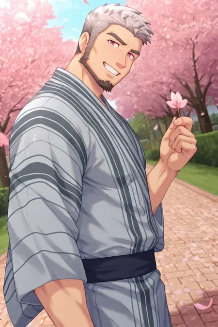 Goro= gornomcb-2ndmale focus, gornomcb_2ndmale facial hair, grey_gornomcb_2ndmale hair, pink eyes,