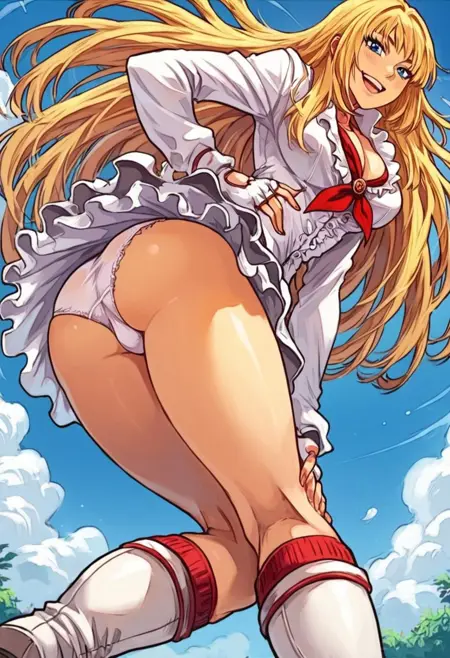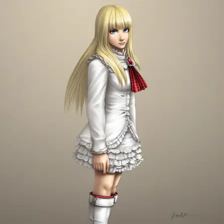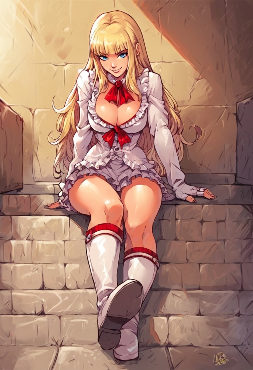 Outfit: White blouse, red ribbon, frilly skirt, white thigh-high boots, red garters, white gloves,