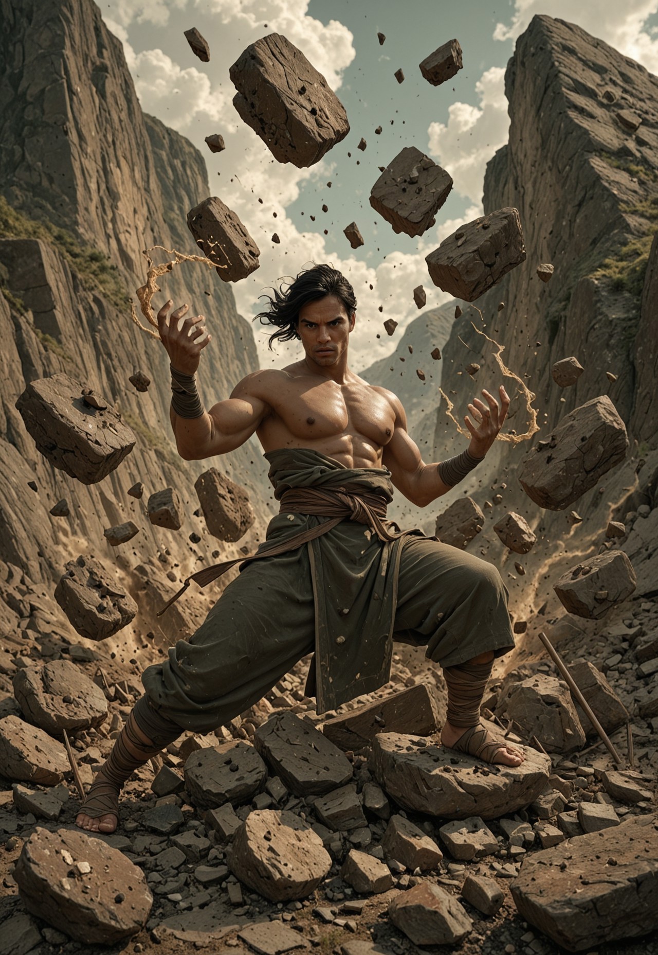 Earmagmb2, earth magic concept, casting earth magic, rock manipulation, levitating boulders, exploding ground, flying debris, rock