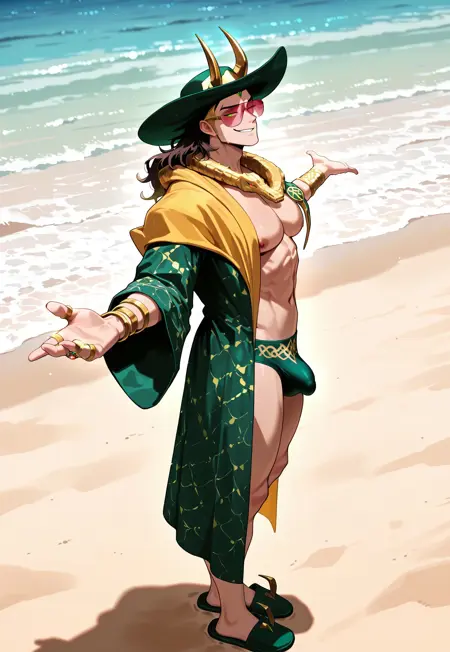 Lok1Beach, pink sunglasses, green sunhat, fake horns, beach robe, green robe, green slippers with horns, gold alligator around neck, green swim trunks, beachwear