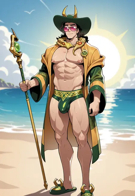 Lok1Beach, pink sunglasses, green sunhat, fake horns, beach robe, green robe, green slippers with horns, gold alligator around neck, green swim trunks, beachwear