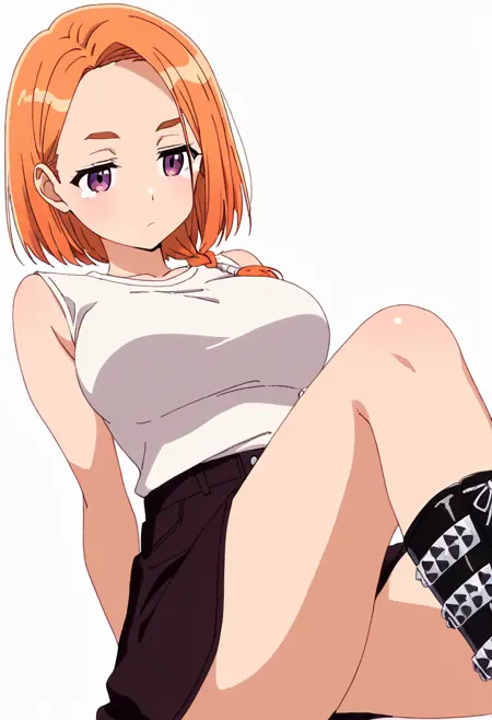 banri_cnr, 1girl, orange hair,long hair,thick eyebrows, purple eyes,large breasts,braid,