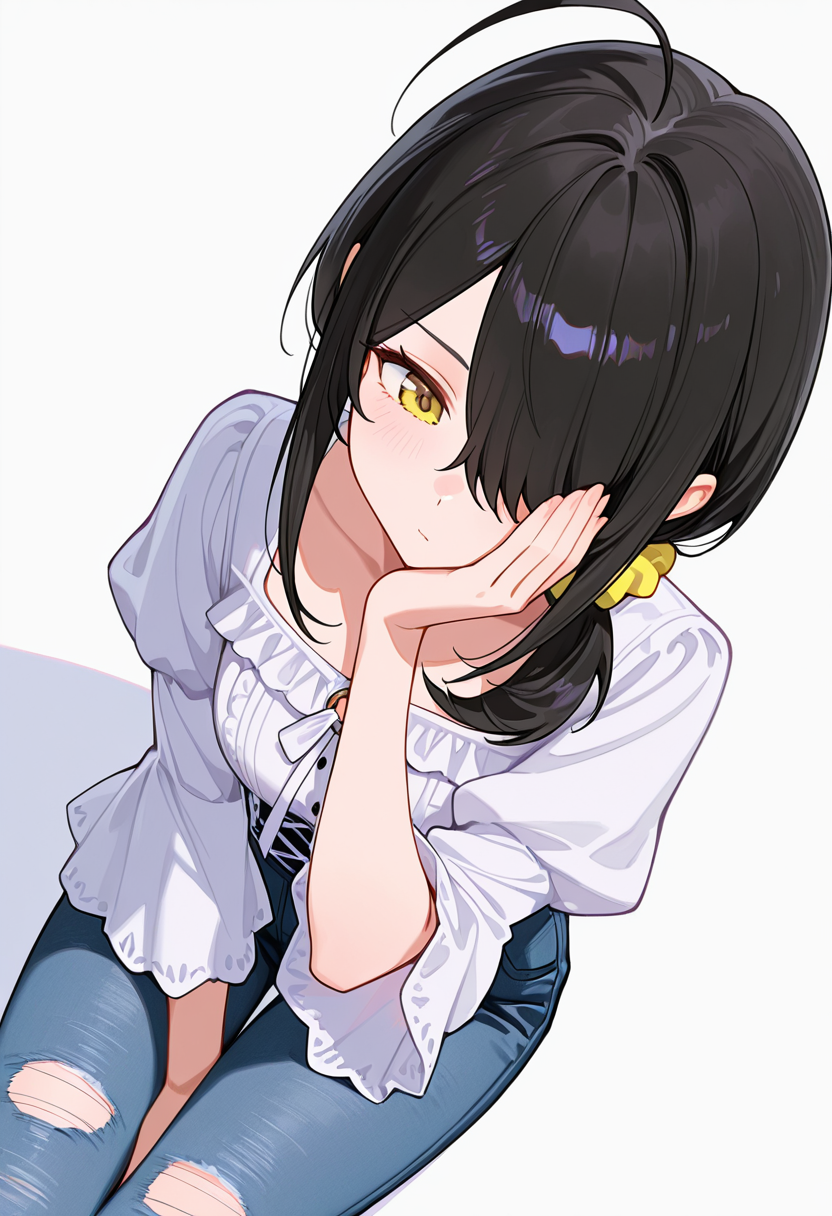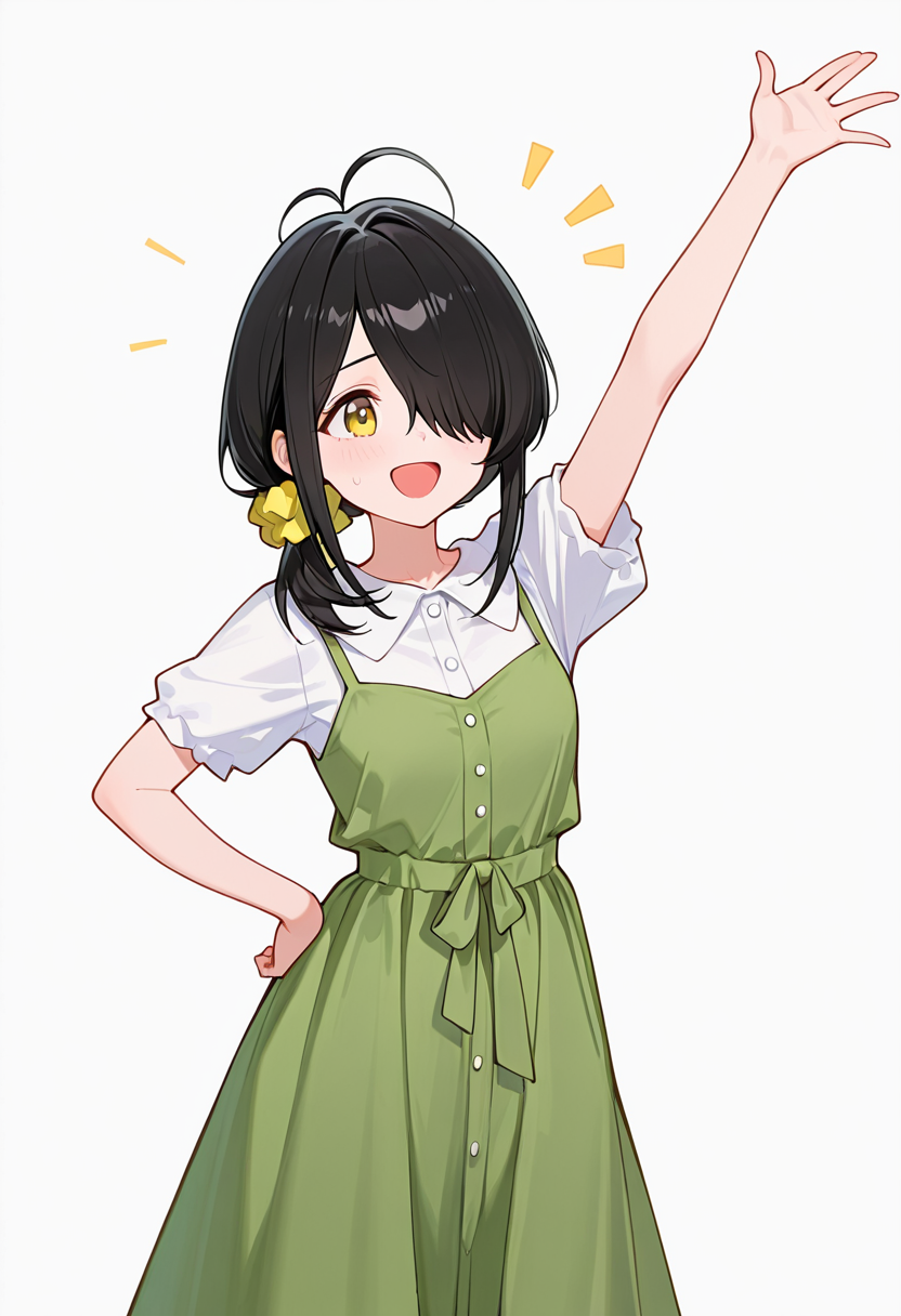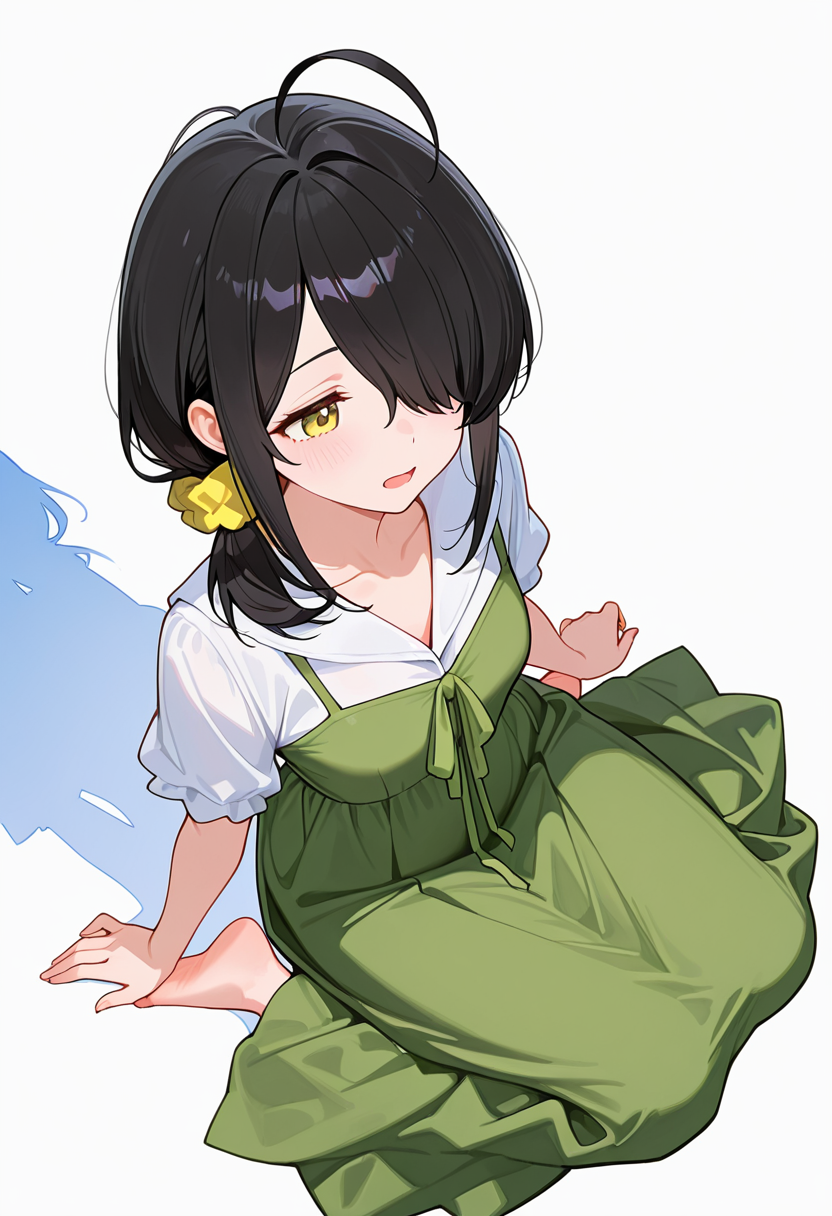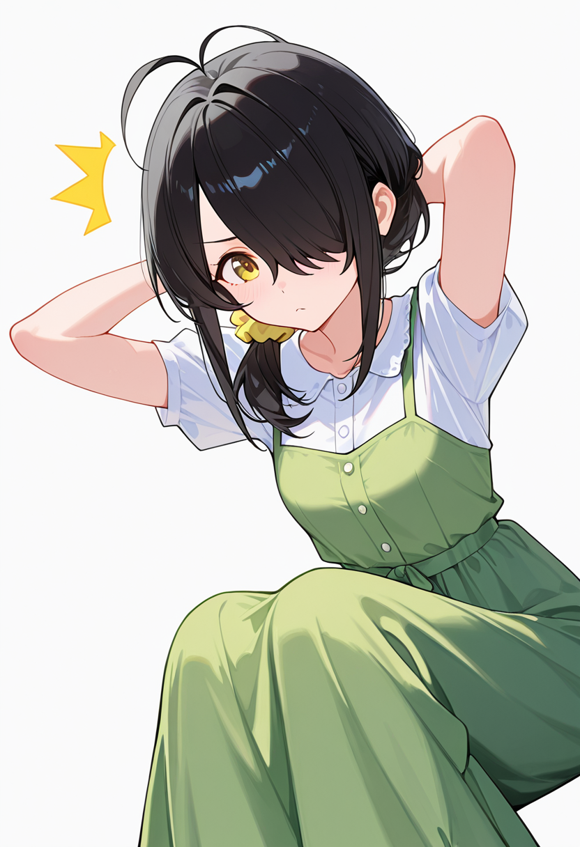 kotono_cnr, enh_cnr,1girl, black hair,hair over one eye, sidelocks,ahoge, yellow eyes, yellow scrunchie,enh_cnr,