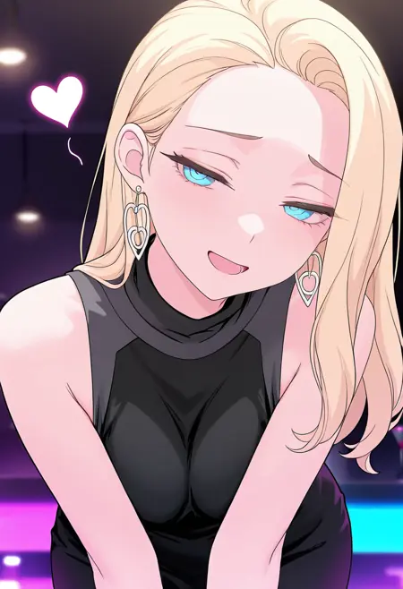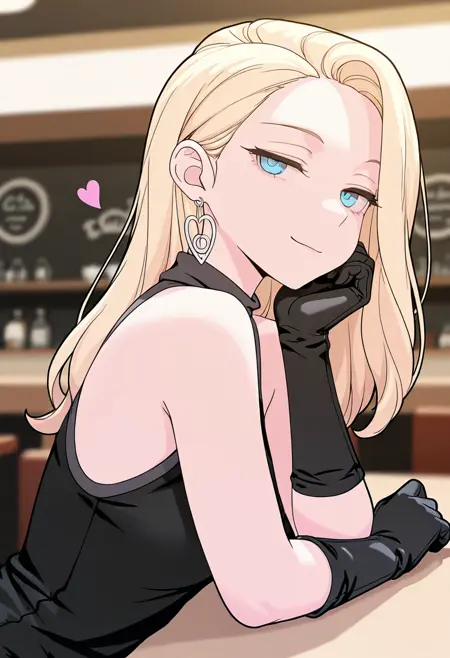 black gloves, black dress, bare shoulders, sleeveless dress, hoop earrings, heart earrings