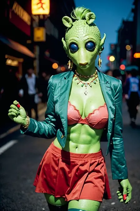 为了在更NSFW的场景中获得良好的皮肤效果,有时在正向提示中加入“绿色皮肤”,在负向提示中加入“连体衣”会有所帮助。然而,我发现这取决于模型,有些模型无需额外提示也能生成优质图像。